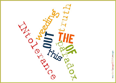 The inspiration for this word cloud stems from exploring the arbitrary ways in which people look at the question of tolerant, versus intolerant, behaviours in the human and natural world. Weeding out fact from fiction in this volatile political climate can be challenging. Much like keeping a garden in check, we must choose what to keep and what to pull. The haphazard scattering of words illustrates the chaotic and myriad choices we make on a daily basis, as well as the anarchic nature of a neglected garden. The coloured fonts represent differences in gender, race, and religion as well as the diverse hues of weeds and wildflowers.